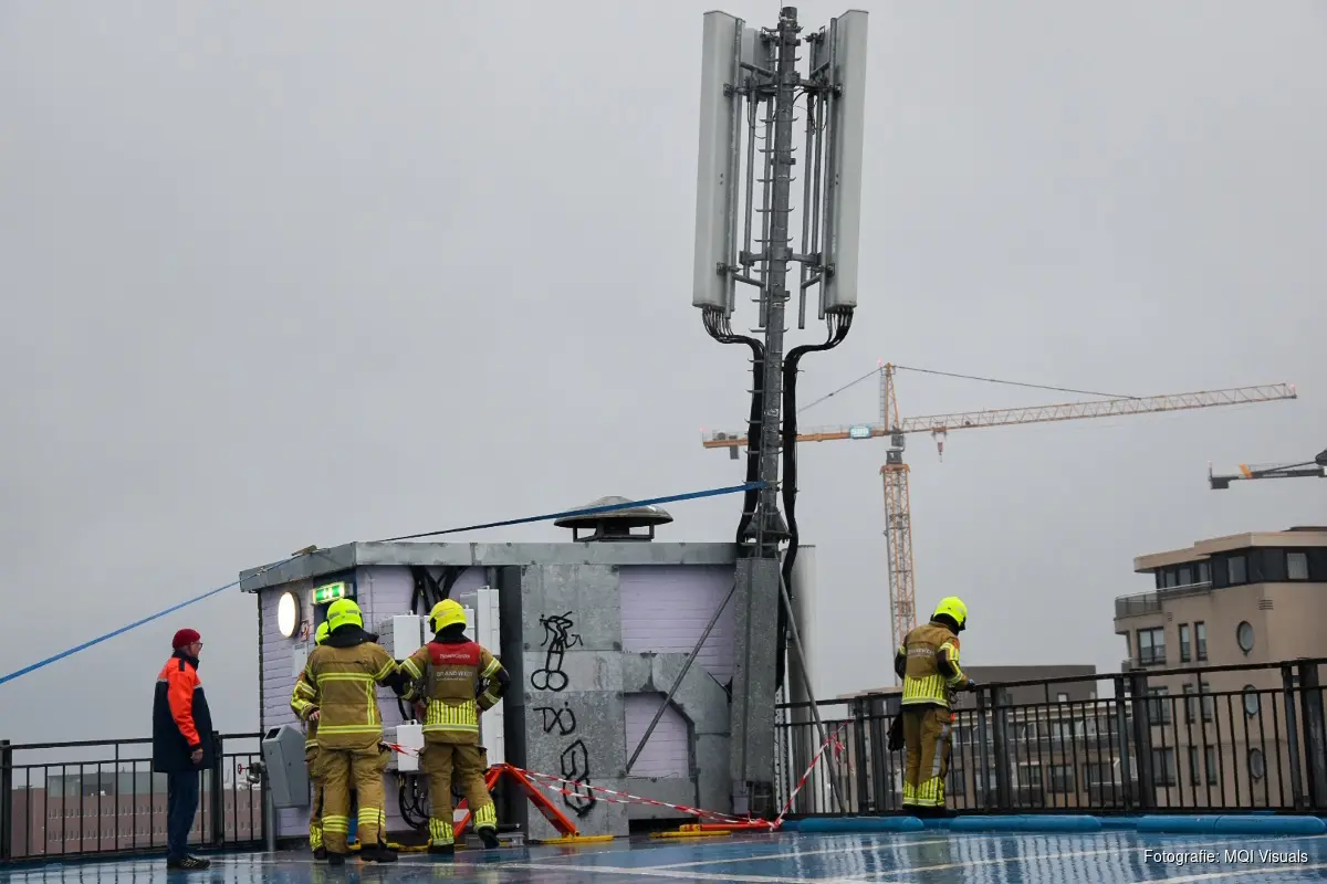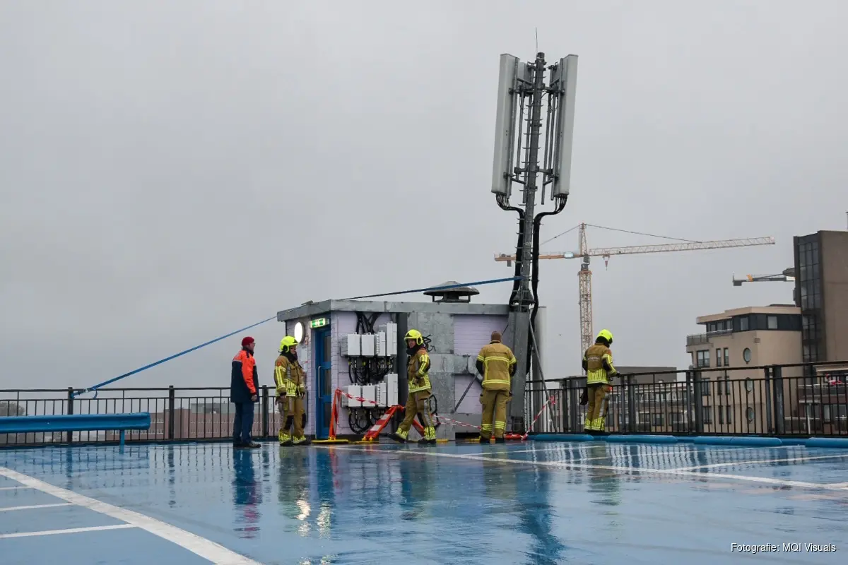 Op het dak van de Alkmaarse parkeergarage dreigde een grote antenne om te waaien, recht naar beneden. De brandweer was snel ter plaatse en heeft een spoedreparatie uitgevoerd door de antenne te zekeren, met onder meer een spanband.