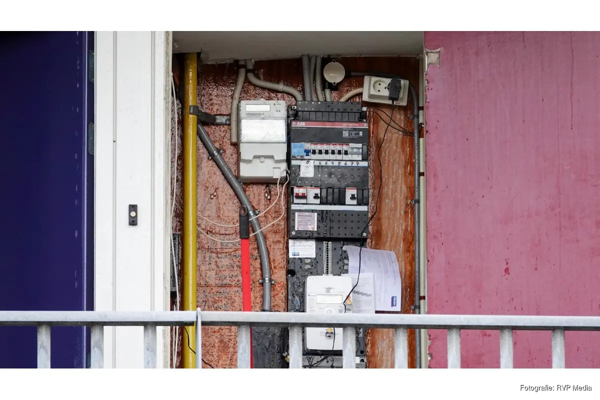 Het water loopt via meterkasten naar beneden toe en veroorzaakt flinke schade. Zeker drie meterkasten zijn getroffen.