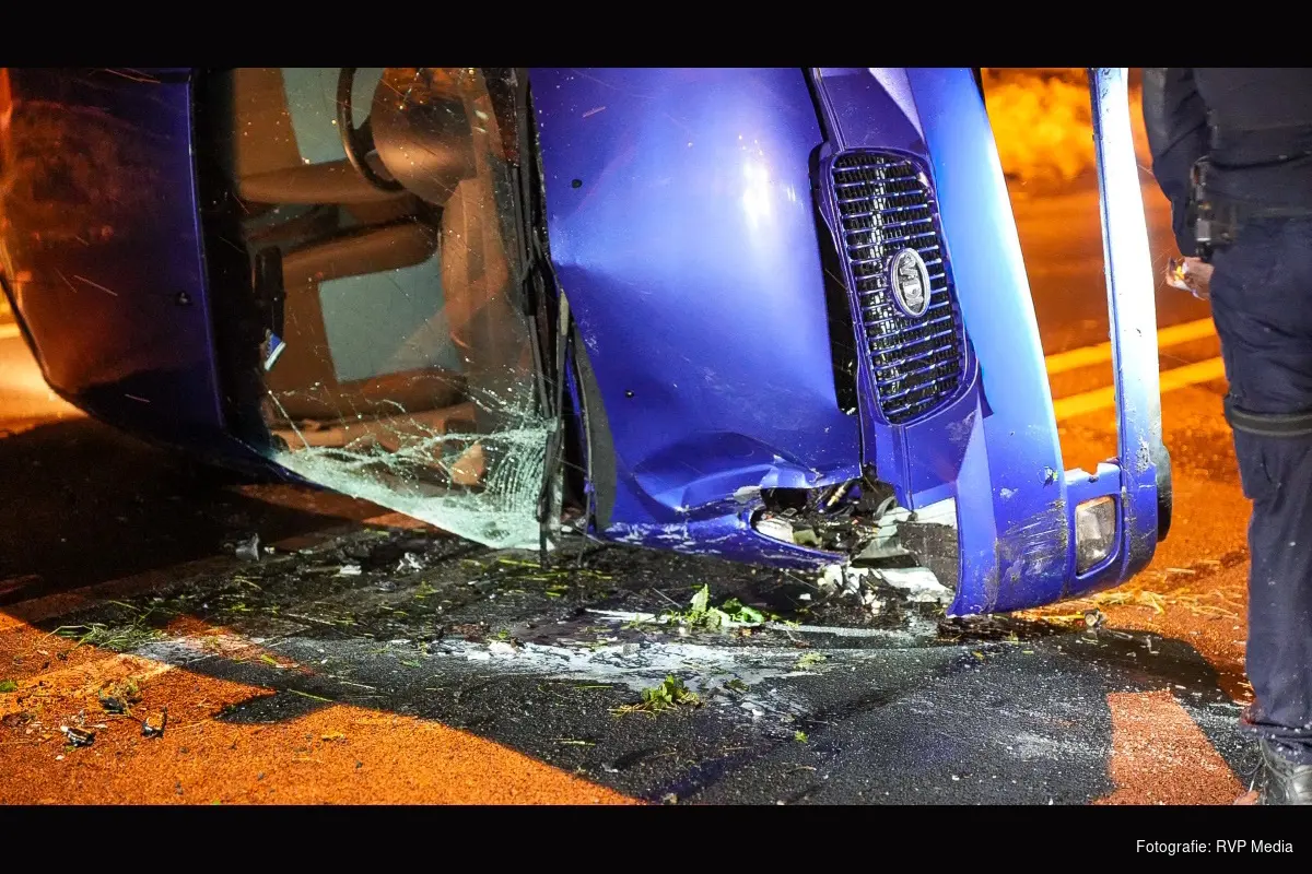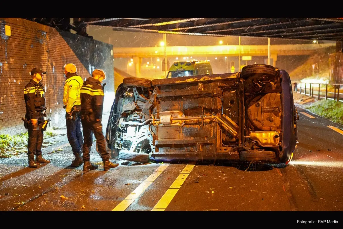 Een automobilist verloor door de gladheid de macht over het stuur in de bocht. De auto botste vervolgens tegen de brugmuur aan, waarna de auto op zijn zijkant tot stilstand kwam op de weg.