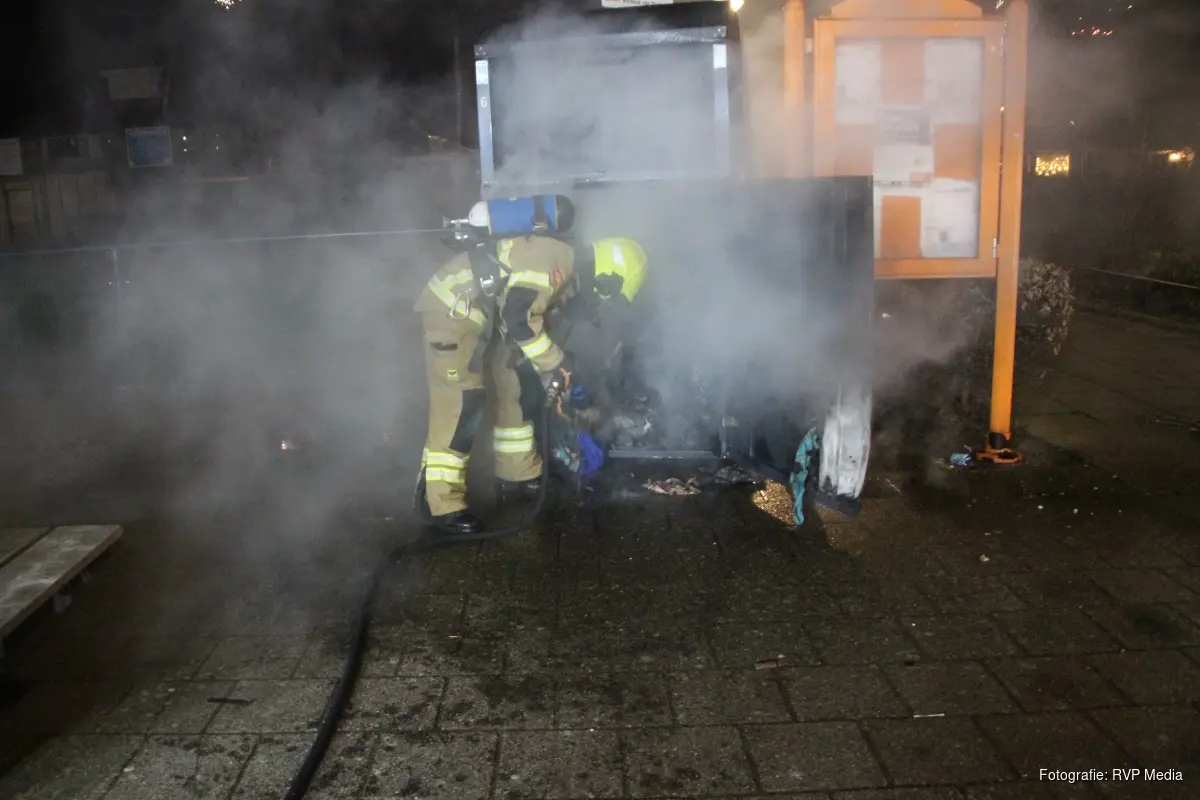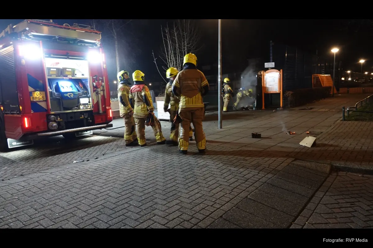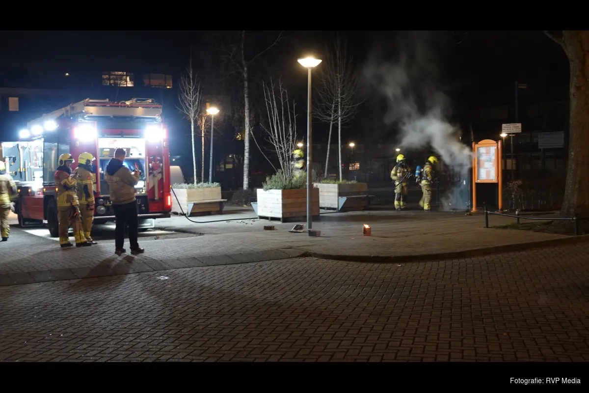 Bij aankomst stond er een kledingcontainer in brand midden op het plein. De brandweer heeft de brand snel onder controle gekregen.