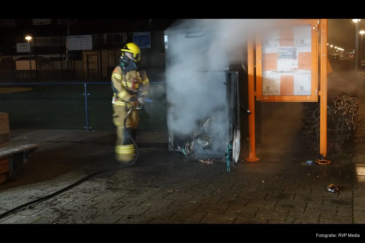 De kledingcontainer is grotendeels verwoest en is niet meer te redden. De oorzaak is vermoedelijk vuurwerk.