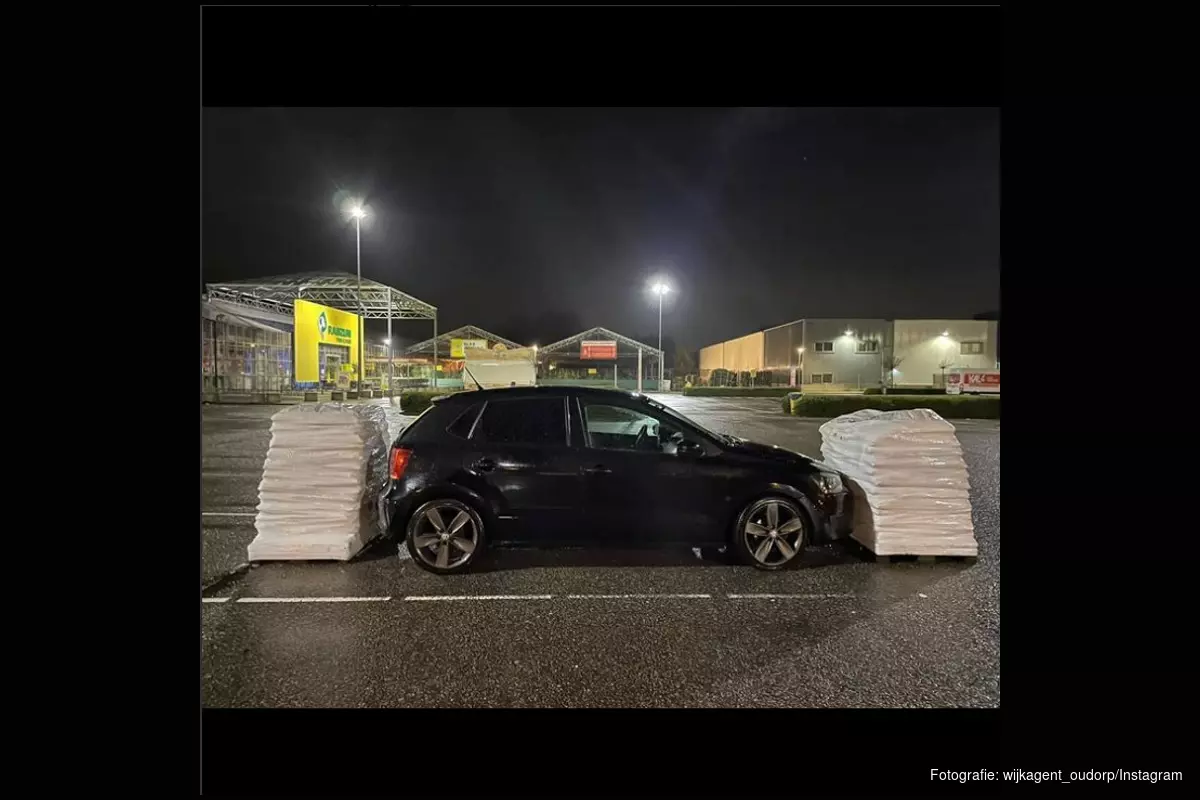 De medewerkers bouwden het voertuig op vakkundige wijze in door de voor- en achterkant te barricaderen met pallets. Dit meldt de wijkagent van Oudorp op Instagram, die de humor van de actie wel kon inzien.