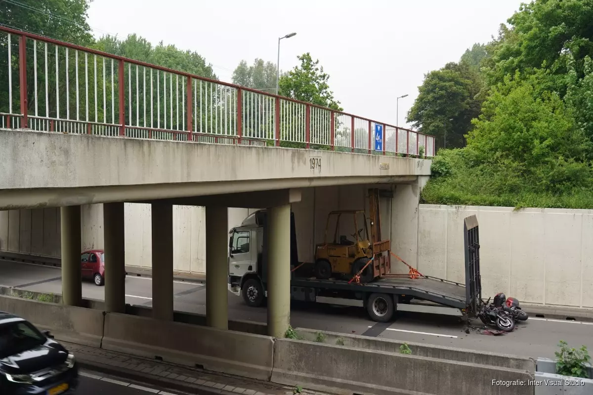De vrachtwagenchauffeur remde af bij het spoorviaduct van de Westerweg omdat hij dacht dat zijn oplegger mogelijk te hoog zou zijn. De motorrijder zag dat te laat en klapte achterop de vrachtwagen. Deze man is met onbekend letsel meegenomen naar het ziekenhuis .