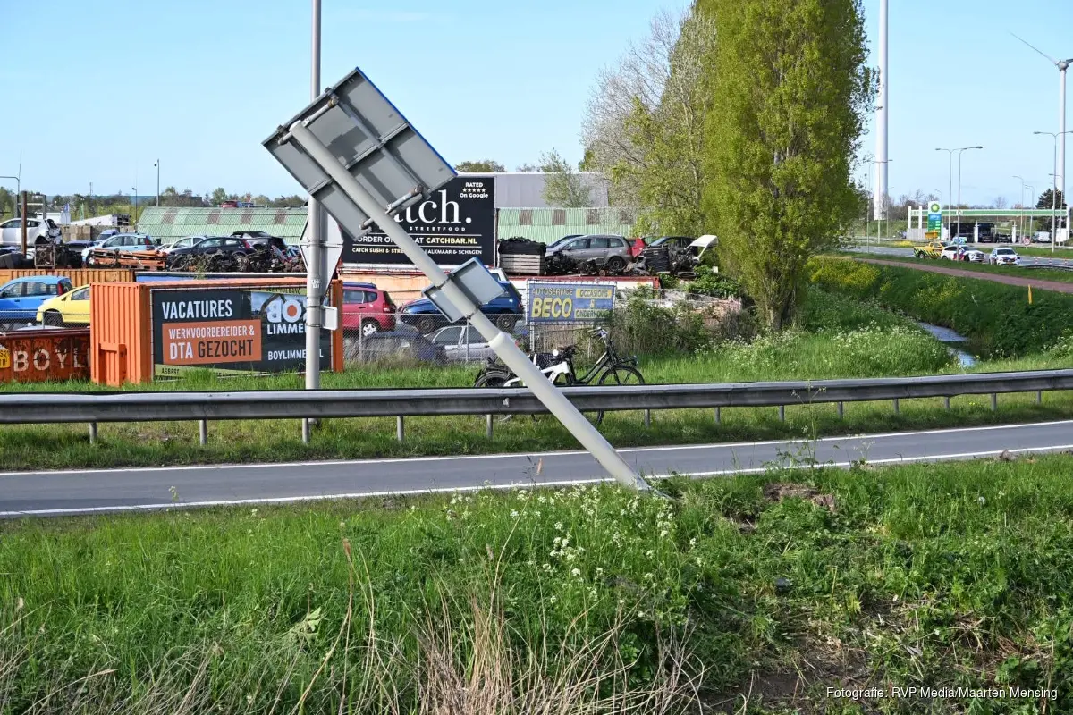 De afrit was vanwege het incident enige tijd volledig afgesloten voor het verkeer. Een bergingsbedrijf heeft de auto uit de greppel getakeld en afgesleept.