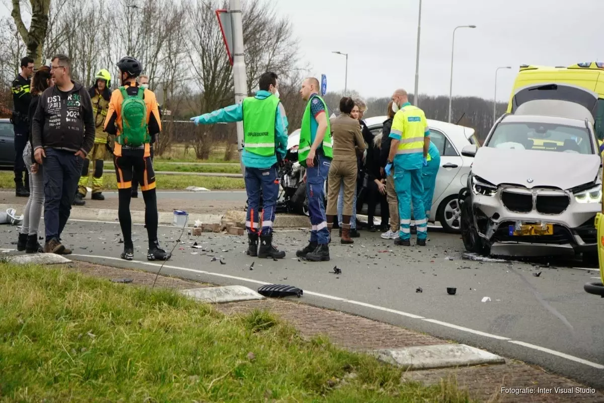 Twee auto's botsten tegen elkaar. Vier personen zijn met onbekend letsel naar het ziekenhuis gebracht. Vermoedelijk gaat het om een voorrangsfout. Dat zal de politie met de verkeersongevallenanalyse onderzoeken.