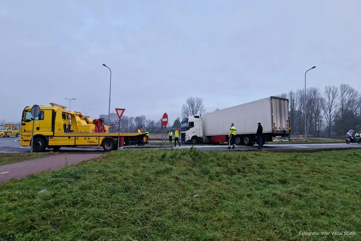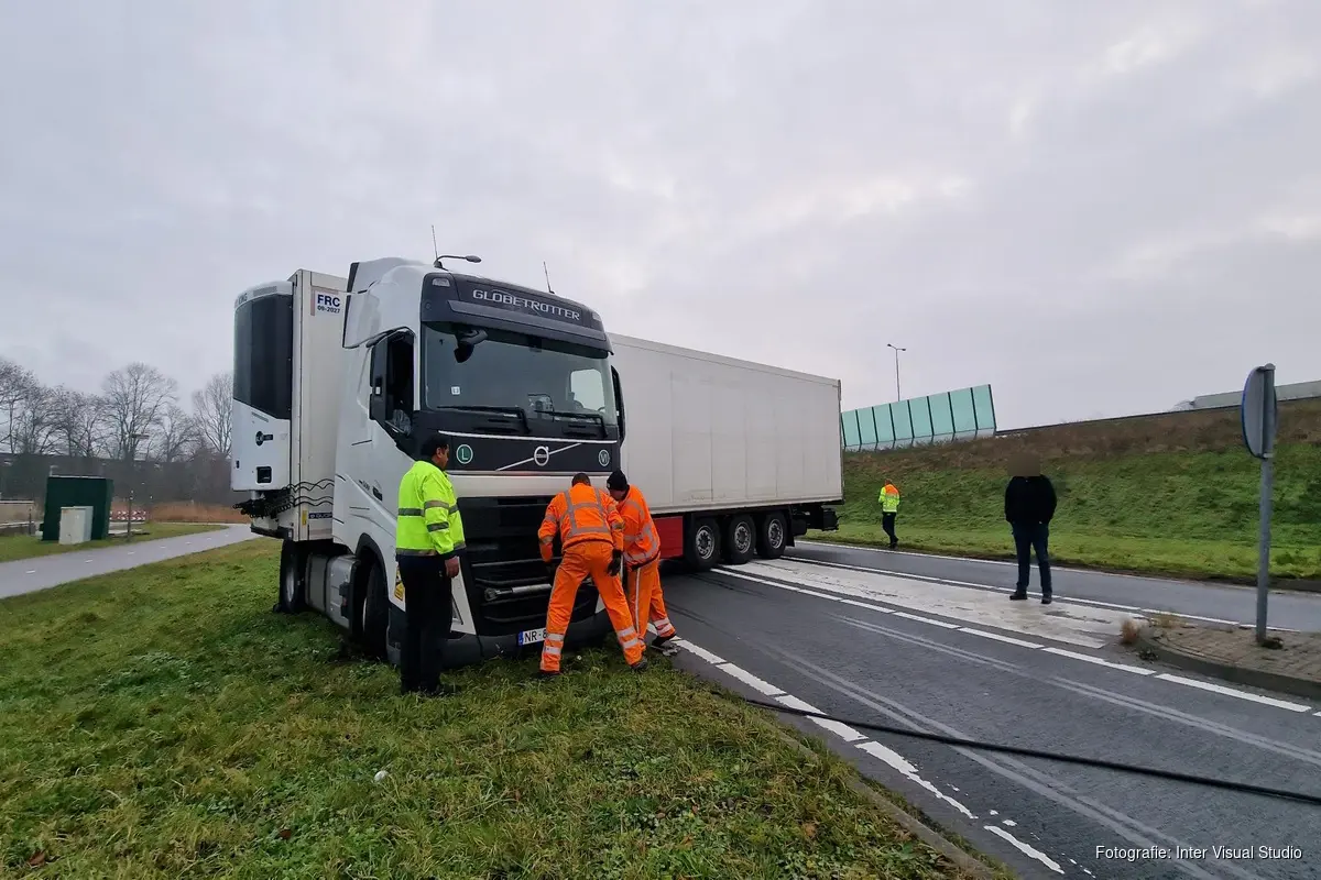 ALKMAAR - Dinsdagochtend is er een vrachtwagen geschaard bij de afrit van de Ommering (N242), niet ver van het AZ-Stadion in Alkmaar.