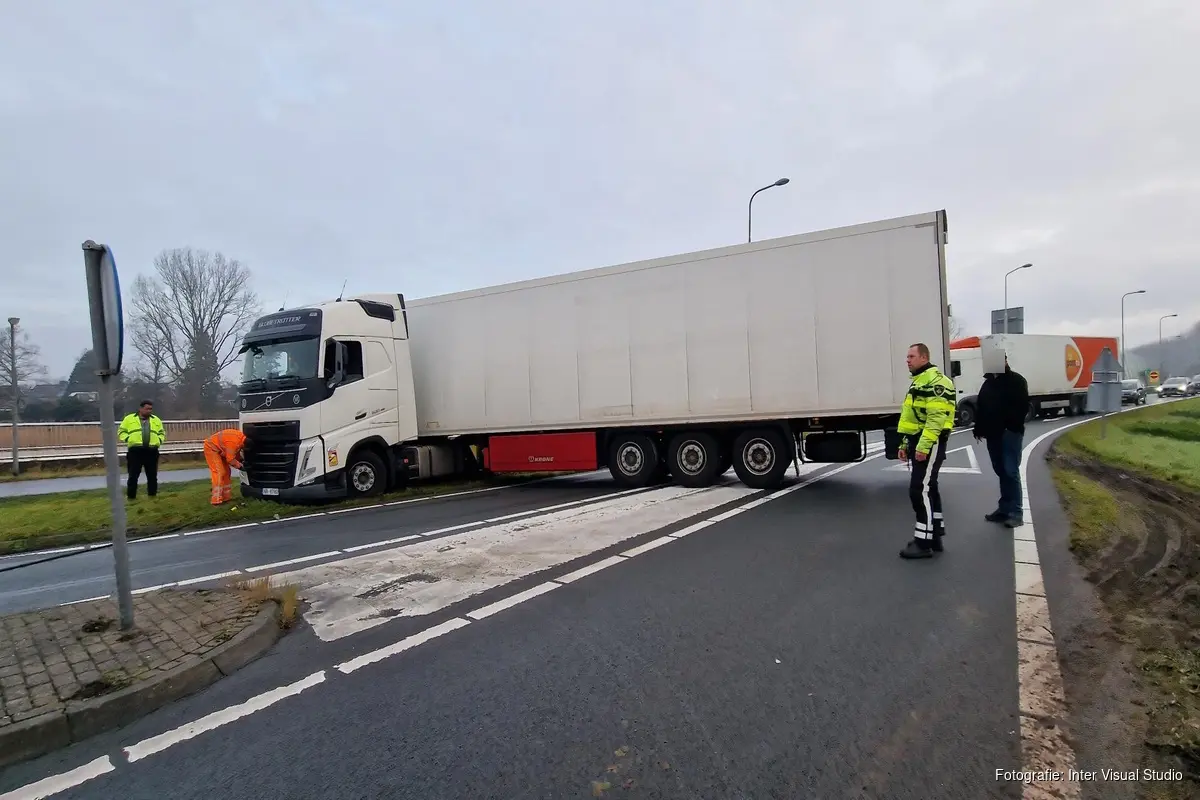 Het lijkt erop dat de chauffeur wilde keren. De trailer staat overdwars over de weg en her spitsverkeer kan er niet langs. De afslag is afgezet voor het verkeer. Er zal een grote vrachtwagen van een berger moeten komen om de combinatie los te krijgen.