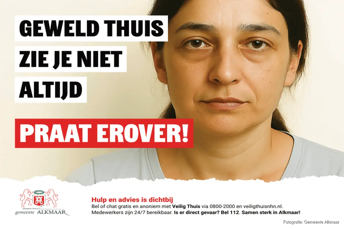 Achter Alkmaarse voordeuren is soms geweld. Dat kan lichamelijk geweld, zoals slaan, schoppen en verwonden zijn. Maar ook geweld dat niet te zien is: psychisch geweld. Denk aan uitschelden en vernederen, bedreigen en bang maken. Heeft u vragen of zorgen over onveilige situaties thuis? Bij uzelf of iemand anders? Praat erover met iemand bij wie dat goed voelt. Ook Veilig Thuis luistert, denkt mee en geeft advies. Bel of chat gratis en anoniem via 0800-2000 en Veilig Thuis NHN – Veilig Thuis Noord-Holland Noord. Medewerkers zijn 24 uur per dag beschikbaar. Deze oproep is vanaf maandag 3 november te zien op onder andere digitale schermen en borden door heel de gemeente Alkmaar. De campagne met ook ervaringsverhalen in de Stadskrant en op social media loopt nog door tot en met maart 2026.