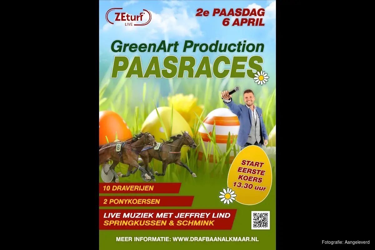Iedereen is paasmaandag 6 april van harte welkom in de Alkmaar ZEturf Arena voor een prachtige dag paardensport in stadspark de Hout. Start van de eerste koers 13.30 uur. Er zijn maar liefst tien draverijen en twee mini pony koersen. Voor de kids is er bovendien een luchtkussen en het schmincktheater. Bij de infobalie ontvang je alle info over het reilen en zeilen op een drafbaan en krijg je alle uitleg over de koersen. Na afloop van de laatste koers is er nog een gezellig live-muziek optreden van Jeffrey Lind. Entree is 9 euro. Het 12-zijdig drafprogramma met alle tips koop je voor slechts één euro. Kinderen tot en met 17 jaar vrij entree.