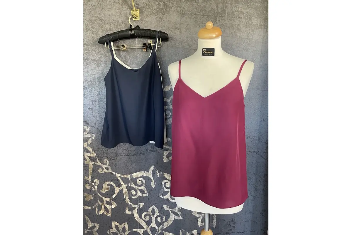 Simone werkt het liefst met natuurlijke materialen als wol, zijde, kwaliteitsdenim, leer en kant en heeft een zwak voor ouderwetse kleermakerstechnieken en mooie details. Zo maakte ze een jeans bomberjasje met de eeuwenoude Japanse sashiko borduurtechniek, een vintage Schiaparelli jasje op basis van een oud patroon en een prachtige top in zijden crêpe satijn en crêpe de Chine die geïnspireerd is op de mode in de Netlix-serie The Queen’s Gambit.