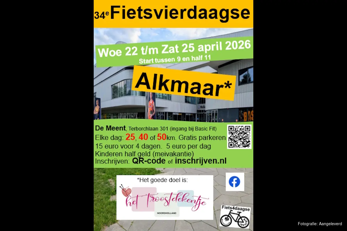 ALKMAAR - De Fiets4daagse Alkmaar is terug! Van woensdag 22 tot en met zaterdag 25 april 2026 staat de 34e editie op het programma, met vier dagen afwisselend fietsplezier. Start en finish is de kantine van Sportcomplex De Meent, Terborchlaan 301 (ingang bij Basic Fit) Alkmaar.