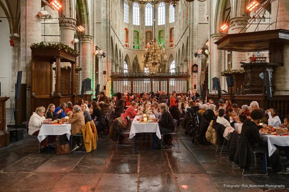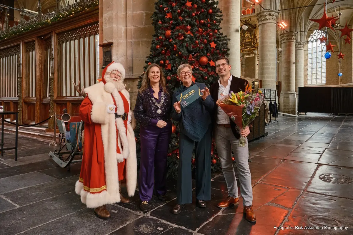 ALKMAAR - Grote Kerk Alkmaar verwelkomde op zondagochtend tijdens een bijzondere kerstbrunch haar 250.000ste bezoeker van 2025. De brunch, speciaal georganiseerd voor gezinnen en ouderen die in deze tijd wel een extraatje konden gebruiken, stond in het teken van ontmoeting, delen en samen vieren. Burgemeester Anja Schouten reikte de feestelijke bloemen uit aan Wilhelmien de Vries, zangeres bij popkoor Girls & Company.