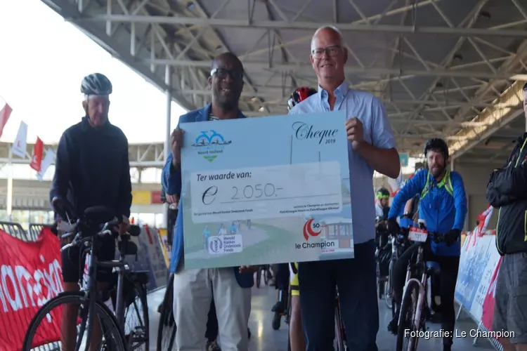 Voorafgaand aan de start reikte Cees Pronk, directeur Evenementen bij Le Champion, een cheque uit aan Jerrel Oron van het Wereld Kanker Onderzoek Fonds. De deelnemers van de Fiets4Daagse Alkmaar en de Fiets4Daagse Hoorn haalden samen €2050,- op voor dit goede doel. Met dit geld kunnen zij verder onderzoek doen naar de relatie tussen voeding, leefstijl en kanker.