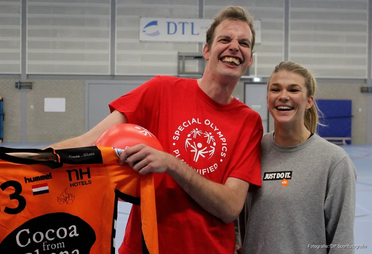 Als warming-up mocht Wester echter eerst nog even “sparren” met Milan die deel uitmaakt van het G-team van KSV handbal. De uitdager vuurde eerst een serie strafworpen af op de Oranje-keepster, en de afspraak was dat degene die verloor een rondje door de zaal moest rennen daarbij roepend ‘Ik heb verloren!’. Milan wilde dit natuurlijk niet laten gebeuren en won de eerste serie waarna Tess tot hilariteit van het ruim opgekomen publiek haar rondje moest doen. Dat publiek kwam overigens niet allen voor Wester want het ‘Milan, Milan’ schalde minstens net zo hard door de sporthal. Wester liet het echter niet op haar zitten en won de volgende serie waarna ook Milan zijn ronde moest doen.