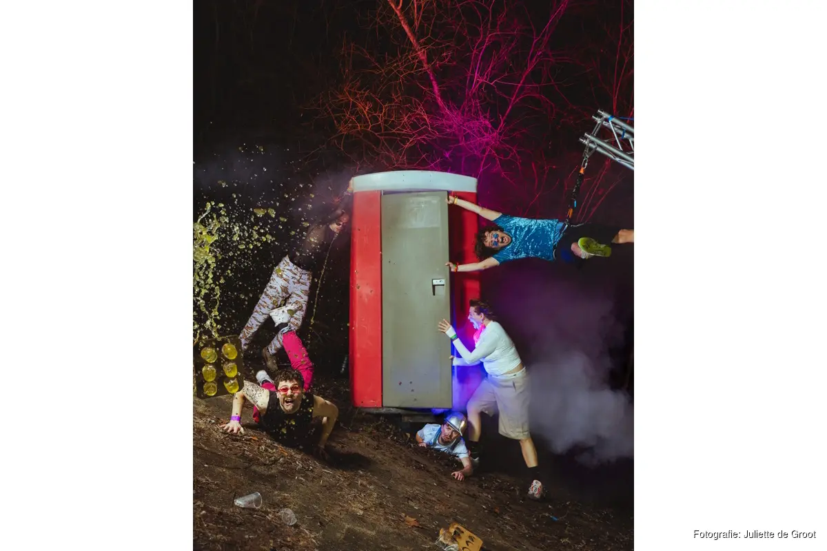 DIXI. speelt op een opvallende locatie aan de rand van het Karavaan Festivalhart, bij de toiletten. Een plek die in de voorstelling zelf het startpunt vormt van een onverwachte afdaling naar een ondergrondse wereld.