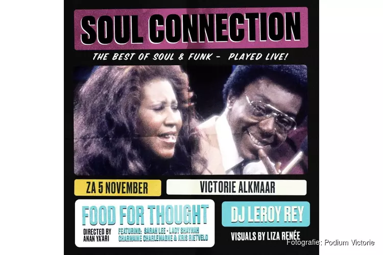 Soul Connection biedt daarbij een avondvullend programma. Live op het podium staan deze keer de begenadigde muzikanten van Food for Thought, onder leiding van Anan Ya’ari. De band wordt bijgestaan door een aantal geweldige vocalisten: Sarah Lee, Lady Shaynah, Charmaine Charlemagne en Kris Rietveld. Daarnaast kan naar hartenlust worden meegezongen en gedanst op de heerlijke soulplaten die worden gedraaid door DJ Leroy Rey. Het plaatje wordt compleet gemaakt door de kundige visuals van Liza Renée.