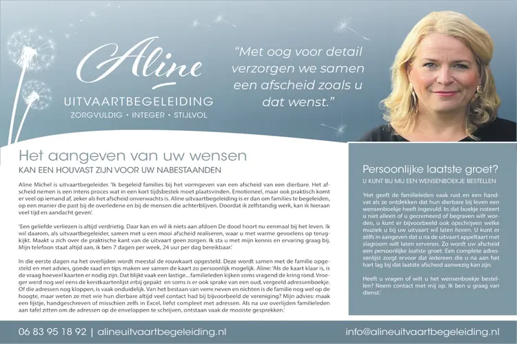 Aline Michel is uitvaartbegeleider. ‘Ik begeleid families bij het vormgeven van een afscheid van een dierbare. Het afscheid nemen is een intens proces wat in een kort tijdsbestek moet plaatsvinden. Emotioneel, maar ook praktisch komt er veel op iemand af, zeker als het afscheid onverwachts is. Aline uitvaartbegeleiding is er dan om families te begeleiden, op een manier die past bij de overledene en bij de mensen die achterblijven. Doordat ik zelfstandig werk, kan ik hieraan veel tijd en aandacht geven’.